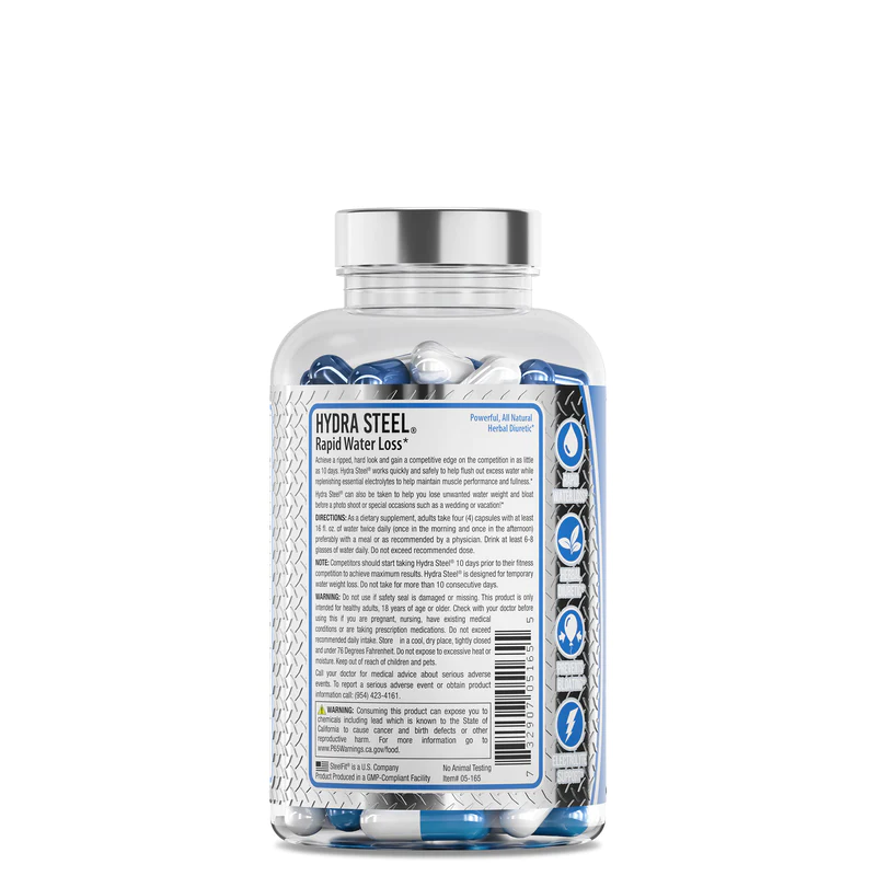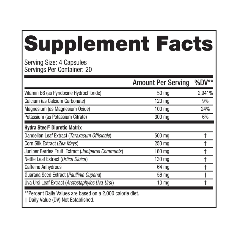 - 利尿サポート:Hydra Steel は皮下水分の排出を促進し、余分な水分を体から排出することを促進する成分が含まれています。